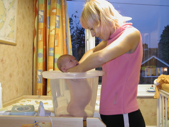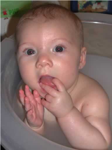 Auntie Jo bathes her niece in the tummy tub. 7-10-01