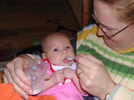 Aimee eating her first solid food,