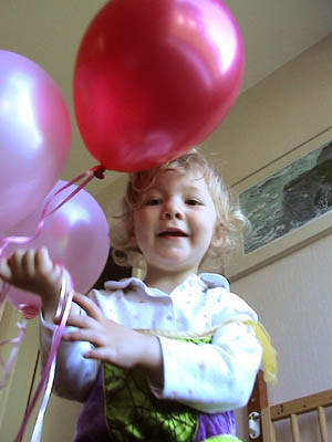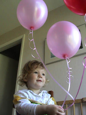Aimee plays with some balloons from Ros' Hen